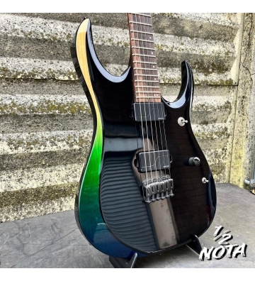 Body: Frassino Top: Acero Manico: Nitro Wizard Panga Panga/Noce 5pz Tastiera: Ebano Macassar Scala: 673mm Capotasto: 43mm Tasti: 24 Jumbo con trattamento Sub-zero Segnatasti laterali: Fluorescenti Ponte: Mono-Rail Pickup: 2x Fishman Fluence Modern Humbucker Controlli: Volume, Selettore pickup 3 posizioni Altri selettori: Selettore Voicing Fishman Fluence su controllo sul volume (push/pull), selettore coil-tap Meccaniche: Gotoh MG-T autobloccanti Bottoni per tracolla: Schaller S-Lock Logo Ibanez: luminescente Made in Indonesia Finitura: Midnight Tropical Rainforest