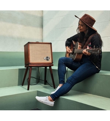 Taylor Circa 74 AV150-10 Amp Mahogany W/Stand J07AA0A00A03AD Amplificatore PER CHITARRA ACUSTICA Canali: 2 Potenza totale: 150W Speaker: 1x Altoparlante 10" Ingressi: 1x 1/4" (chitarra), 1x XLR-1/4" combo (microfono), 1x 1/8" (ingresso aux) Uscite: 1x XLR (uscita DI), 1x 1/4" (uscita linea) Cuffie: 1x1/8" Bluetooth: Sì EQ: 2x EQ a 3 bande Riverbero: sì Caratteristiche aggiuntive: Supporto per amplificatore in mogano (incluso) Materiale di costruzione: mobile in mogano Alimentazione: cavo CA IEC standard Dimensioni (LxPxA): 375 x 234 x 422mm Peso: 10kg