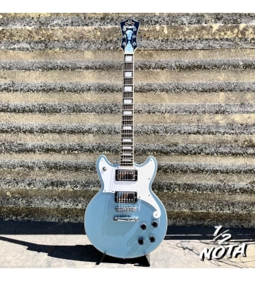 Colore dell'hardware: Cromato Forma Della Paletta: Standard Intarsio Del Logo: Madreperla D'angelico Logo New York Intarsio Serie (Anteriore): Logo Premier Shield in madreperla Numero Di Serie (Posteriore): Nome Del Modello, Numero Di Serie Rilegatura: 3 Strati Finitura: Lucida Spilla A Testa: Cupola Sintonizzatori: Grover 109 Super Rotomatic Stringhe: D'angelico Elettrozinco Anni 10 (10-46) Copertura Del Truss Rod: Grattacielo In Alluminio Larghezza Del Dado: 1 11/16" Materiale Del Dado: PPS Materiale della tastiera: Ovangkol Rilegatura: 3 Strati Filo Da Tastiera: Alpacca Vintage Media Lunghezza Scala: 24.75" Raggio: 14" Intarsio Superiore: Blocco di perloide bianco Indicatore Laterale: Sì Numero Di Tasti: 22 Materiale del collo: Sciarpa in acero Finitura del collo: Satinato naturale Profilo: Forma A C Tipo Di Giunto: Set-thru Spessore: 1f: 20mm, 12f: 22mm Truss Rod: Doppia Azione Forma Del Corpo: Doppia Spalla Mancante Stile Del Corpo: Corpo Solido Profondità Del Corpo: 1.625" Larghezza Del Corpo: 13.25" Colore: Ice Blue Metallic Finitura: Lucida Materiale Superiore: Basswood Materiale Posteriore: Basswood Materiale Laterale: Basswood Rilegatura: 3 Strati Ponte: Cromato Tune-o-matic Cordiera: Barra Di Arresto Battipenna: Stile F-Hole, bianco solido (5 strati) Piastra Posteriore: Nera Selettore Di Pickup: Attiva/disattiva A 3 Vie Manopole: 4 manopole di velocità nere Bottoni Del Cinturino: Cromati Panoramica elettronica: 2 Humbucker / 2 Volume / 2 Toni (Push/pull) / Interruttore A Levetta A 3 Vie Pickup (Manico): Seymour Duncan Designed HB-102 Humbucker (Cover cromata) Pickup (Ponte): Seymour Duncan Designed HB-101 Humbucker (Cover cromata Pots: 500mila