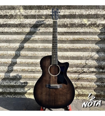Corpo e ponte Materiale superiore: Abete Sitka massiccio Materiale corpo: Mogano Dimensione del corpo: Grande OM-14 Fret Cutaway Lunghezza totale: 102cm Lunghezza del corpo: 50cm Bocca superiore: 29cm Bout inferiore: 41cm Profondità: 10cm Ponte: Micarta Finitura: PU-Lacca Colore: Neroburst Manico e Tastiera Materiale del manico: Mogano Costruzione: Articolazione del manico a coda di rondine Materiale della tastiera: Micarta Intarsi della tastiera: Madre di Pearl Dot Materiale del dado: Osso Finitura: PU-Lacca Lunghezza della scala: 645 mm Hardware& Elettronica Hardware Colore: Cromo Macchine per accordare: Diecast Battipenna: Nero Corde: D' Addario EXP 16 Elettronica: Fishman Isys+ Controlli del preamplificatore: Volume/Bassi/Alti/Phase/Accordatore